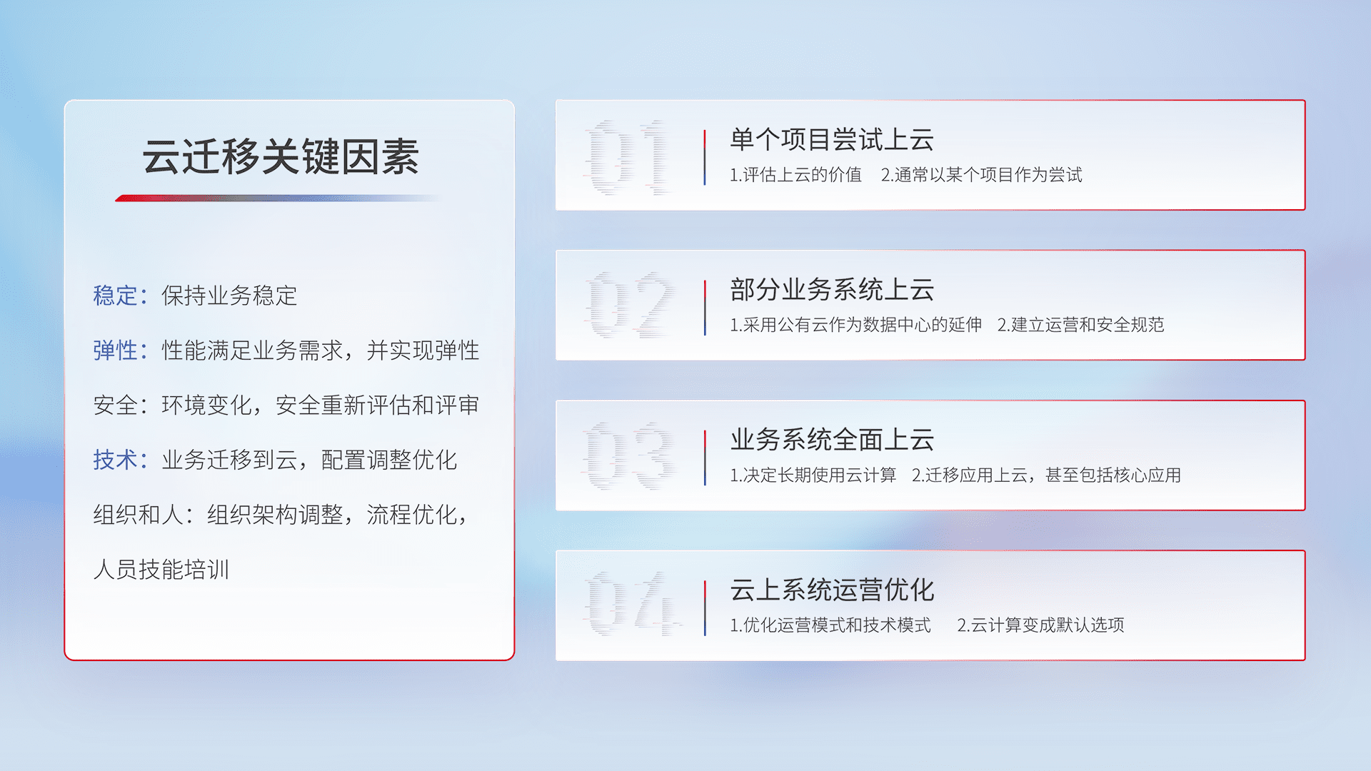 结合实际业务,,,,从规划设计、、、、云平台选型、、云原生改造、、数据迁移、、集成交付,,,迁移全过程为客户识别最佳上云路径,,,做好风险识别管理,,,设计网络架构、、身份权限、、、安全审计合规、、操作审计、、、、日志审计、、、、监控告警策略、、多站点容灾设计等,,,,对云上基础设施进行整体规划,,,,提升IT治理水平,,以满足弹性、、、、高可用、、、高性能的需求。。。